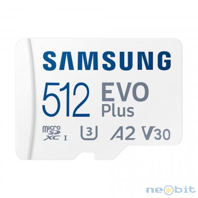 Samsung EVO Plus MB-MC512SA/EU microSDXC spominska kartica s kapaciteto 512 GB in vmesnikom UHS-I. Ponaša se s hitrostjo branja do 160 MB/s, razredi U3, V30 in A2 za predvajanje 4K video posnetkov in aplikacij. Združljiva z Android napravami, tablicami, prenosniki in igralnimi konzolami. S priloženim SD adapterjem.